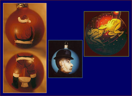 On the left you see Father Christmas in a strange - and very human - situation. The decoration in the middle is inspired by Magritte. Frogs on skis on the right.